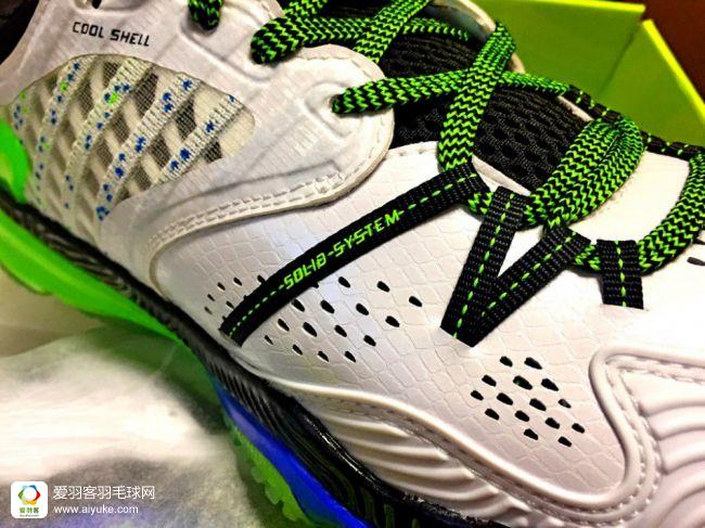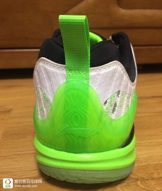 后部:后跟的外部有一块绿色的NYLON12硬尼龙片提供较好的支撑,在后跟鞋邦和鞋带孔处并没有看到常见的一整块大面积的TPU抗拉伸支撑片。取而代之是竖斜交错的多道热压TPU条,这样虽然提高了后跟透气性,但是在抗拉伸上还是与传统的整块TPU比还是略显微弱不足。