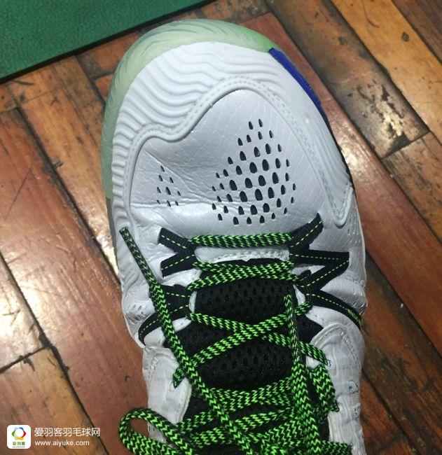 前端:前掌主要区域为反光度较高的亮面太空革超纤鞋面,超纤面的比较柔软,高反光性的鞋面使得前掌亮度十足。在前掌前段上部是一圈较长较款的KPU波浪面,包围着整个前掌前段的大半个侧面,为前掌前段鞋面在上网步伐的时候提供更好的耐磨性。