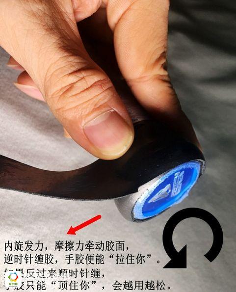 在这里之所以不厌其烦,孔乙已般讲这个简单的“其然”背后的“所以然”,也是为了让大家当上老司机,以后遇到复杂的手胶种类,或者手胶经常松开的复杂情况,就有一个最基本的指导思想:顺发力紧,逆发力松,顺应发力方向,就能缠出一个合理的效果,哪怕暂时做不到,也知道逆发力的缠法是个坑,能及早避免。