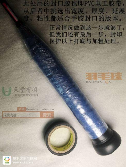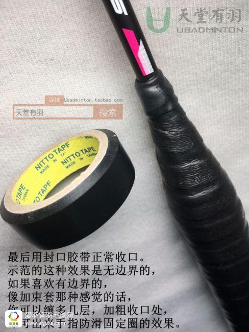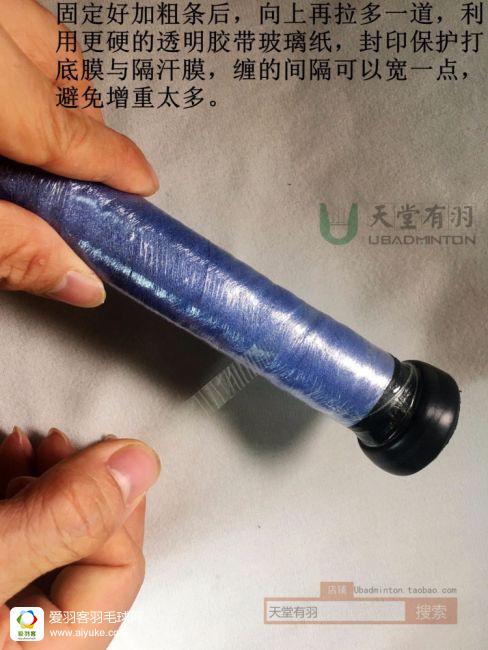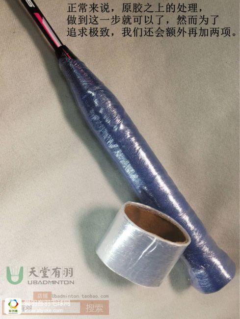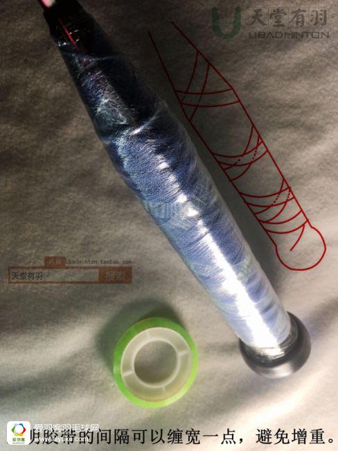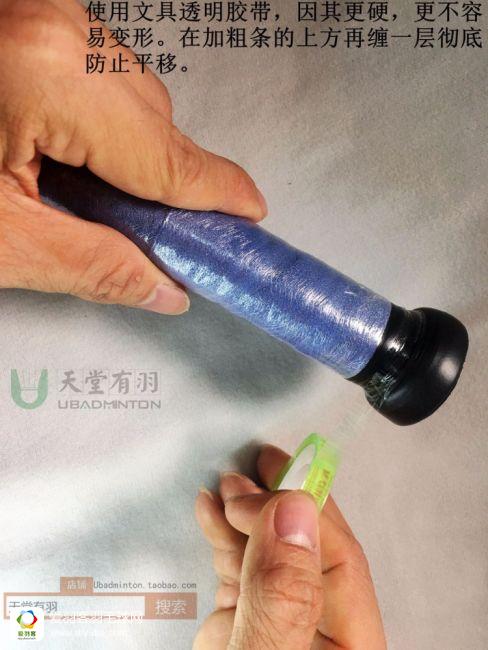 确实,上面步骤是有一点完美主义,略显折腾的,所以如果可以一劳永逸,以后只换最外面的手胶,而不需要连同打底也全部处理的话,相信会更多的人加进这个优雅缠胶的行列来。我的做法是,用文具店能买到的最普通的透明胶带,又窄又薄的那种就行了,在上面圈两下,就能封印所有的打底成果,另外因为这种胶纸比胶带要硬与坚固一点,也可以更好的固定底盖加粗条,详情可以看图片。
