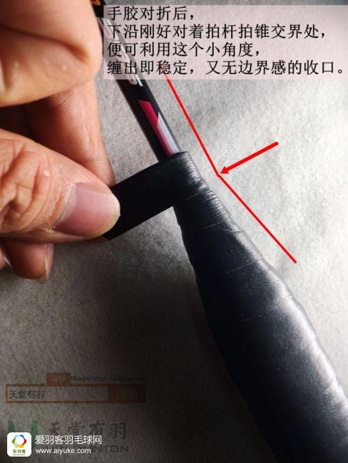 手胶的收口处理如果做得不好,最差的情况就是打着打着松开,但如果不松开,收口收得不好的话,那个位置你潜意识也就不喜欢握上去,你的握拍的灵活度也会受影响。在此我的建议是,利用好锥盖与拍柄的那个接合处,缠出0存在感的收口。