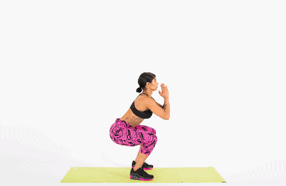 起始姿势为双脚与肩同宽,屈膝屈髋,背部保持平直,双手掌心相对,屈肘90于胸前。