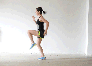 运动时,双脚交替向上快速抬腿,双臂随着运功自然摆臂。注意大腿最少与地面平行。