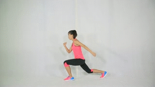 起始姿势为右脚在前屈膝90,膝盖不超多脚尖,左脚在后,屈膝但不能着地。