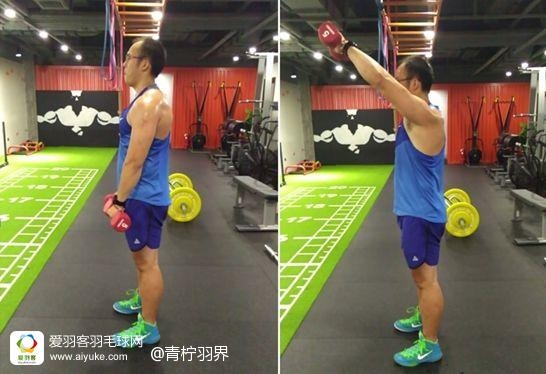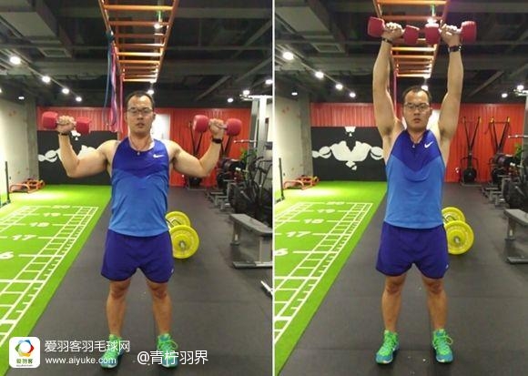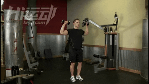 过程:肩部发力将哑铃举过稍高于头部水平面,有节奏的控制下落回到开始位置。