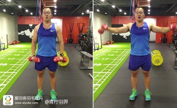 过程:肩部发力外展将哑铃举至略高于肩部,有节奏控制下落回到开始位置。