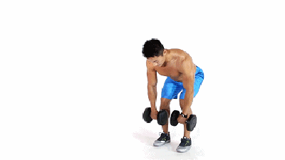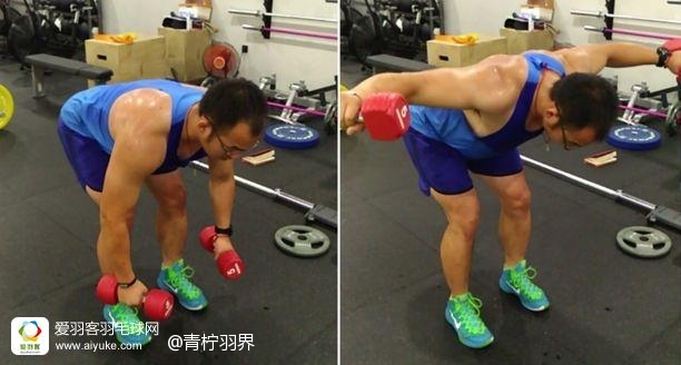 开始姿势:身体俯立,双脚与肩同宽,双手持哑铃自然下垂,肘关节微屈。