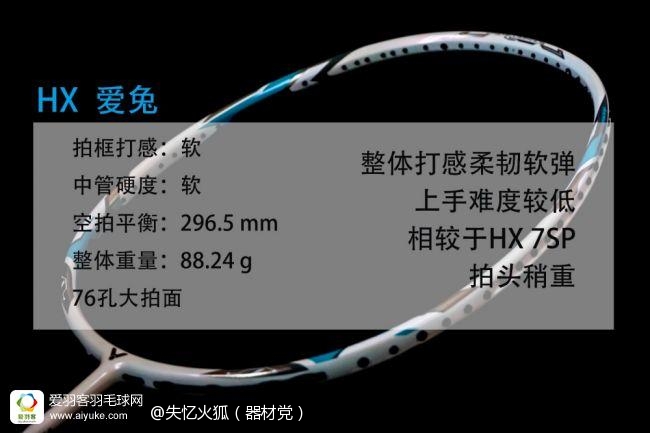 总的来说,爱兔酱是一把打感柔韧软弹的全面型球拍,在中端神器——撞拍王HX 7SP的基础上进行了智能升级,并适当调整了球拍物性,依小狐手中的3U规格来看,爱兔酱的整体重量、挥重与头重感都要较HX 7SP更高一些。拍框软+中管软的特性,使得HX 爱兔很容易上手,不过要想打出高质量的球,还需保证击球动作的完整性。注意展肩送肘、强调鞭甩动作,HX 爱兔在进攻端表现依然出色。