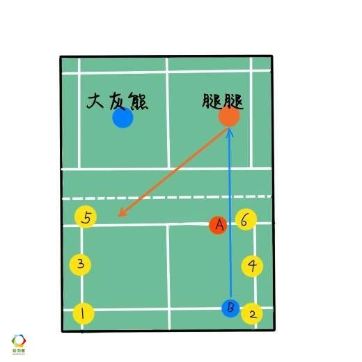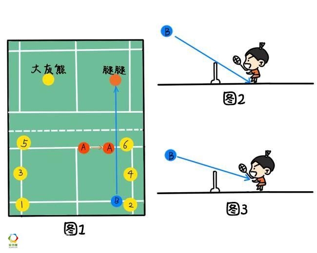 看下图:蓝色B后场杀直线,红色A站直线网前准备封网,腿腿接杀挡对角网前,我又要出题了~