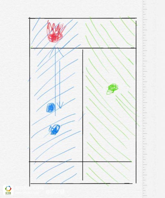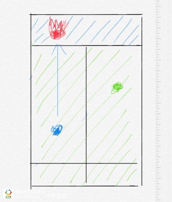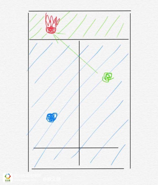 图四:当蓝色自己接网前球并回挑后场的时候,可以看出蓝色自己需要回中防守,而绿色队友不需要任何跑动,也就是说蓝色自己一次半的跑动,换来的是绿色队友节省了体力,以及十分清晰的左右半区的防守面积。这种回球,称之为“过渡球”。也就是我今天希望业余球友能记住的一个直线套路,既省体力又不坑队友。