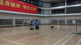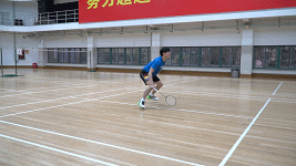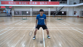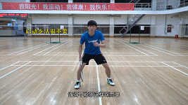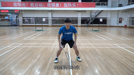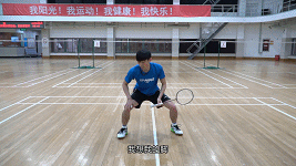 最主要是这颗球出去回来之后相较于主动的球很被动需要极速回位的时候去做这个动作,这个动作我来示范一下,第一颗球打出去,发现很被动,回位一定要迅速,回位迅速之后,回到中间记得要踩这步启动步,那启动步这步很重要,记得不能够这样踩而已,这样踩身体重心还是高的,所以很多的球没办法弯下身