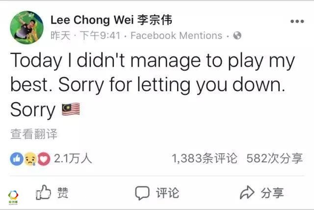他在个人脸书上写到:今天我没能发挥出自己的最好水平。对不起让你们失望了,抱歉。