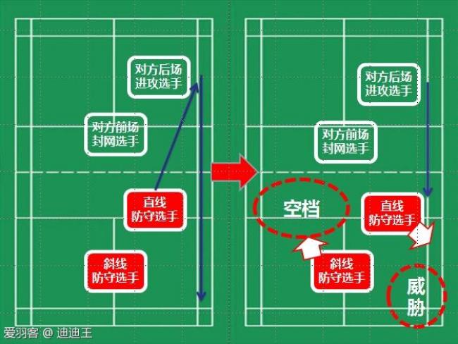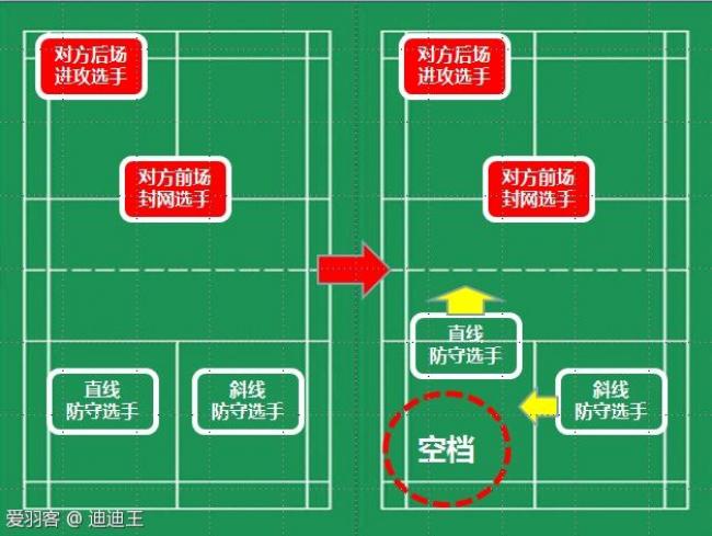 在你方的空档处,通常都是对方会重点打击的区域,在对方看来,空档区域是你方最容易丢球的位置(反过来想就是对方最容易获得胜利的地方)。在非常初级的羽毛球爱好者当中,是不是就有一种战术叫做:前后、左右。一前一后、一左一右,不就是针对对方的空档吗?在这种情况下,我敢保证,你往你方没有人的区域走位,不但不会接不到球,还会接到更多的球。同时,往没有人的地方走,你也是在为同伴解决后顾之忧,弥补空档,真正地践行补位原则。