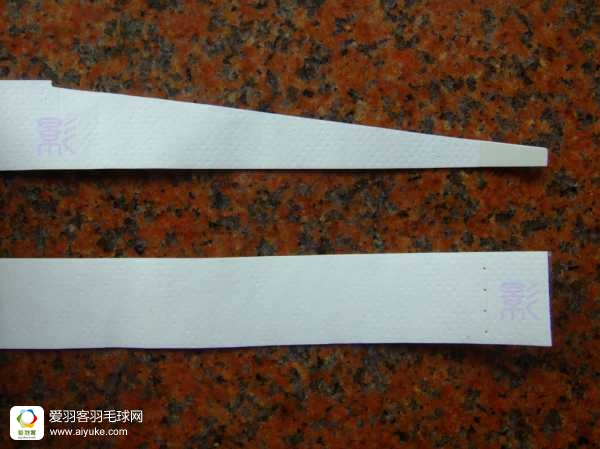 E:手胶一边是齐平,另外一边为箭头,并自带有约1CM的双面胶。使用后粘性非常好,打几次,都不会自动松口。