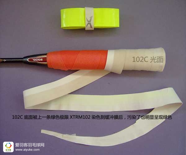 H:耐用性一般,粘性持久差,基本打2次后,废了。打一局闻闻自己的手,有严重的胶味。白色可能还好点,其他颜色不建议使用。同一支球拍就连更换一条新的102手胶使用后,缓冲膜都被污染成绿色并残留在102的底面上,真是悲剧!