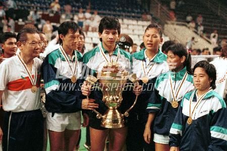 冠军 印尼队:罗天宁、王莲香、洪忠中、郭宏源、维拉华蒂、许钻丽,苏吉亚托,萨尔文达