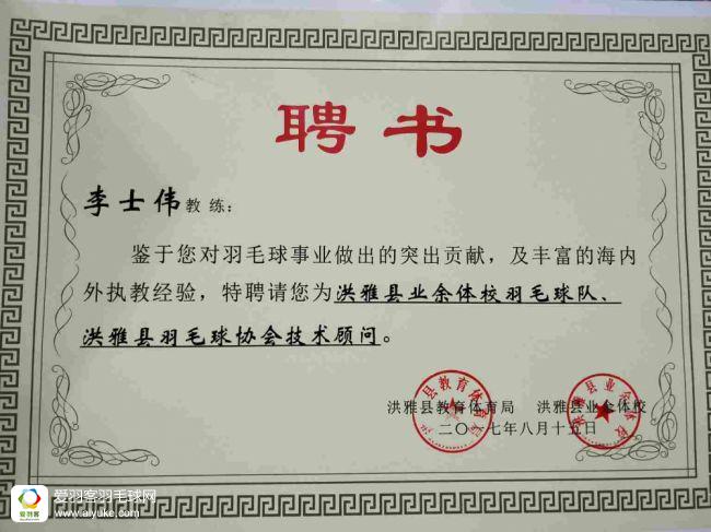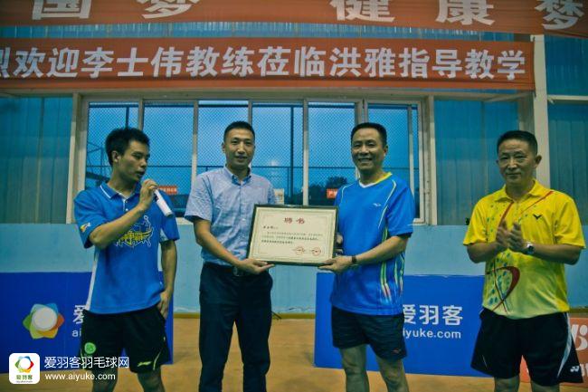 鉴于李老在羽坛的江湖地位,以及他丰富的海内外教学经验、对羽毛球推广所作出的贡献,黄局长代表县教体局颁发给了李教练“洪雅县业余体校羽毛球队、洪雅县羽毛球协会技术顾问”的聘书。随后李教练也分别赠送球衣给教体局代表和协会代表。