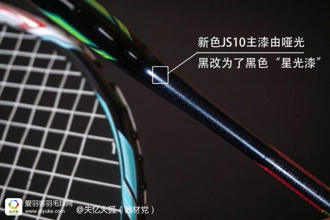 推出近三年,JS10终于推出全新涂装,相较以往的小清新的涂装,新色JS10采用了更加符合现今羽毛球文化潮流的红绿撞色方案,如果说老色JS10是性格古怪相貌平平的闷骚君,那么新色JS10一定是明打明的风流浪子。新色JS10的涂装或许无法成为你的乍看之欢,也或许无法俘获你心、做到久处不厌,但强烈的色彩对比,却可以帮你成为球场上的焦点,吸引场下的目光。