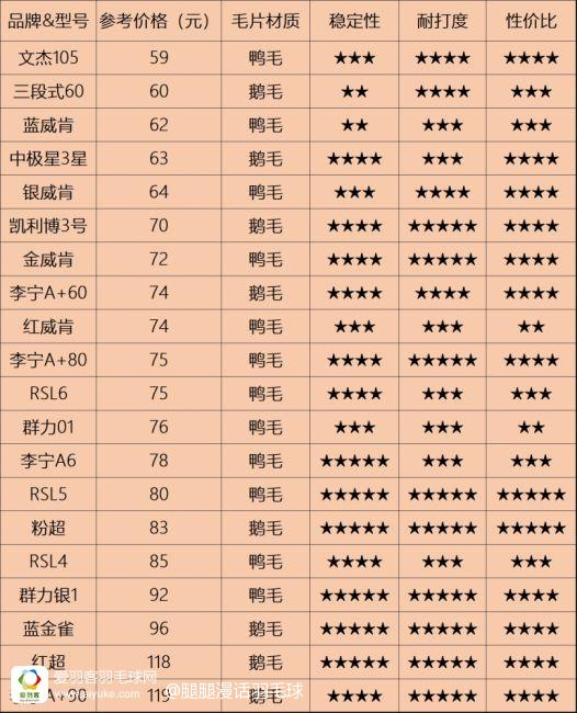 官方介绍:采用精选鸭毛,外观精致,拥有稳定飞行和牢固耐打等出色性能。