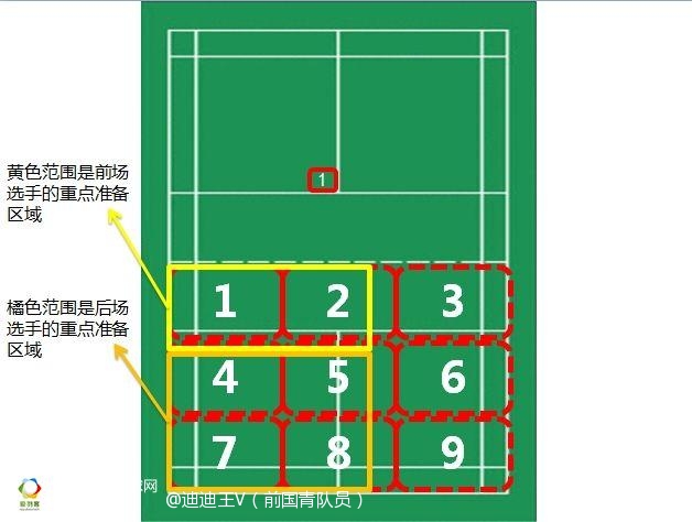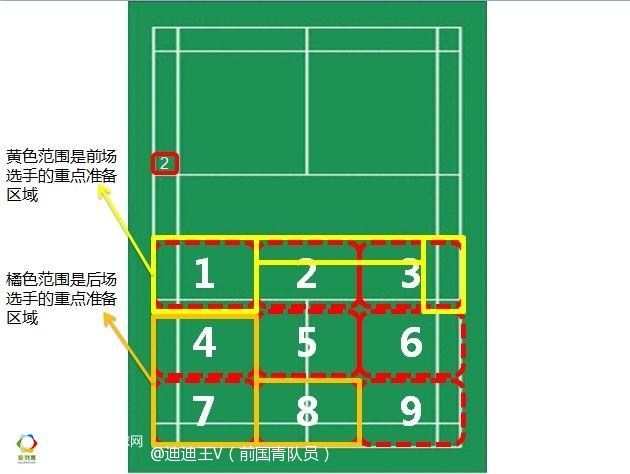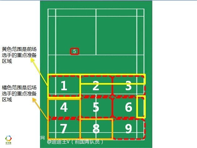 写到这里可能大家会有疑问:那5号位和9号位的球难道就没有吗?当然也不是,9号位的球因为会经过5号位,而这种球容易被后场选手轻松拿到,大多数情况下9号区域的球是后场选手的正手位,接起来难度没有那么大,所以可以作为次要准备区域来考虑。5号位的球只要网前的人随时保持举拍准备,处理好也不难,如果觉得不想处理,网前的选手直接往前走,后场的选手迎前接球,也是很容易的。