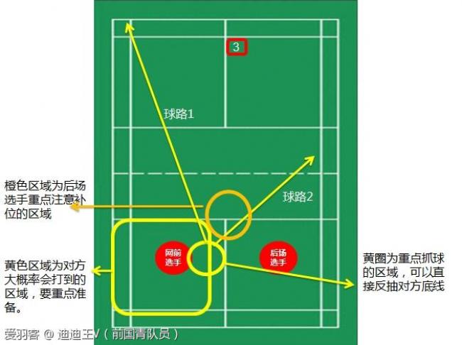 基于上面对于对方击球点的分析,你在给出了3号位发球后,应该立即退回到中场,与你的搭档形成平行站位,也就是防守站位,你重点注意图中黄圈内的区域,这是对手最容易发力的区域,虽说是防守,其实难度也不会太大,因为是你发的后场球,你发球的时候就已经知道了下一拍大概率是防守,所以你的准备时间一定是很充足的,但是注意球一定要发到位。而你的搭档要注意帮你保护中路的前场吊球,这是对方容易打,而你们俩容易出问题的地方。