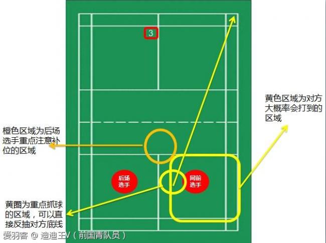 而既然反手是对方明显较弱的区域,说明对方基本上是没有能力将球回到后场的,所以无论单打还是双打,如果对方已经明显地处于反手区域的被动状态,你完全可以放弃后场的区域(即便他打到后场,实际上你也能够来得及退后),提前移动到前半场举拍准备,重点去抓对方反拍过渡的网前球,机会好可以直接扑死。同时举拍是为了防止对方的反拍抽球会打你一个措手不及,这其实就是一个简单的抓球。