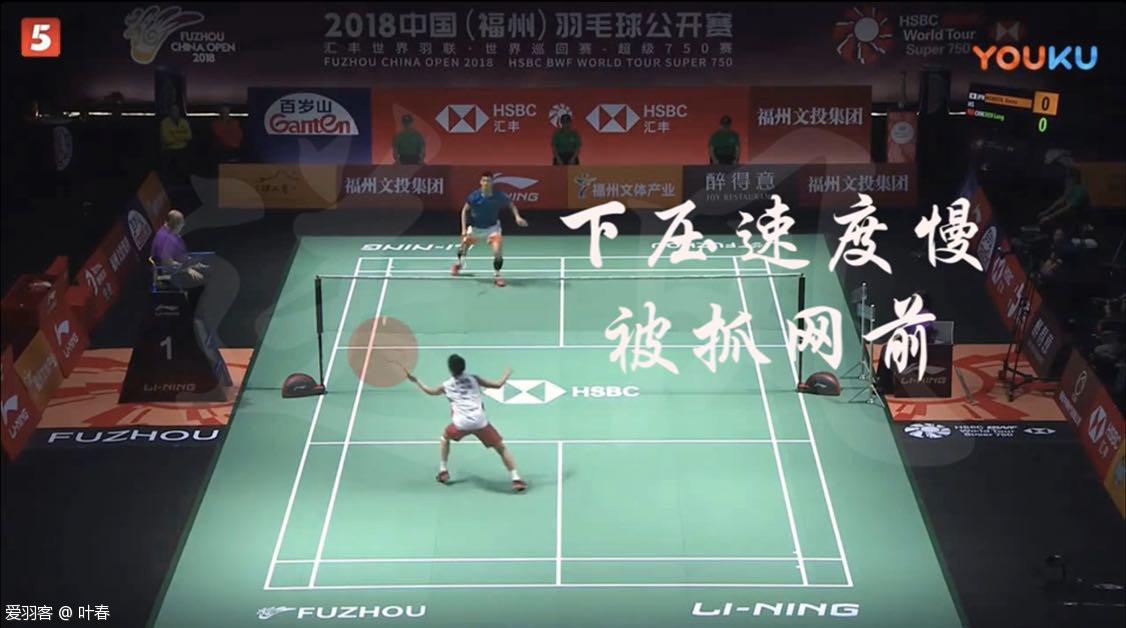 2018年,谌龙正手后场高远球的下压速度较慢,被桃田抓住网前,造成谌龙被动挑球。