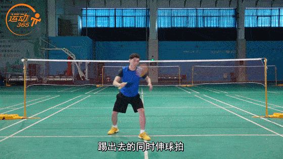 对角的球我们接的时候已经并步了,并步过后,我就直接将我的右脚给踢出去,跨右脚 踢出去的同时伸球拍。这个时候就可以衔接我们的一个反手拍的抽球,或者是扑球。