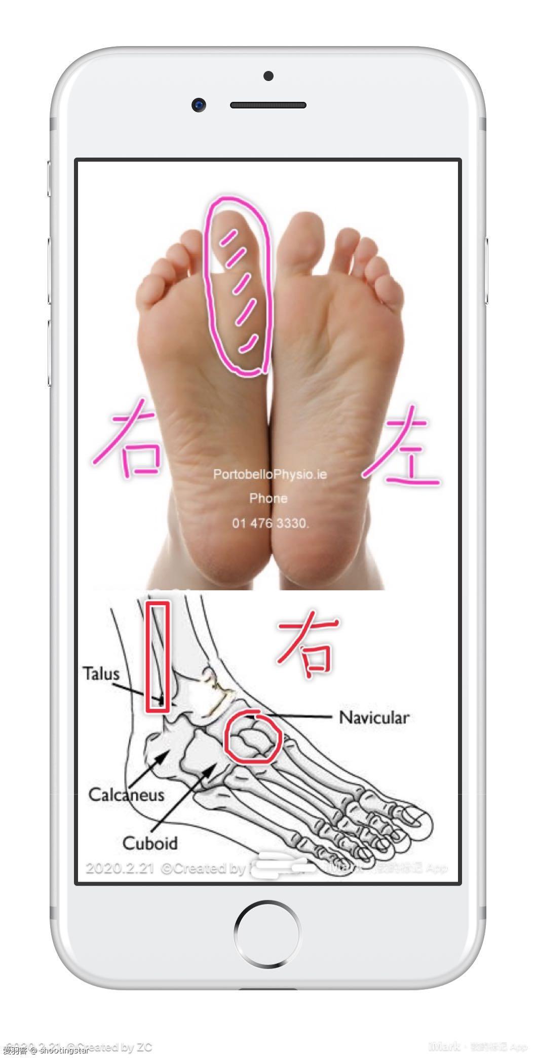 脚底的圈圈就是我在支撑时,脚撑地的补位,身体的很大一部分重量都压在这里(因为我习惯依靠这一部分蹬地启动),而脚底其他部位都是悬空的。长期以来,就造成我脚背上的圈圈部位疼痛(也不知道是筋还是骨),而且这个区域一般不会痛,只是当我再采取这种站立支撑姿势的时候就痛得尤为明显!