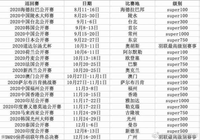 5月22下午,世界羽联官方微博发布了恢复比赛的暂定版本,8月11号开始第一场super100赛事,这比赛安排真是太密集了,连轴转啊。