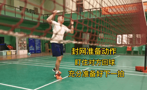 最后呈封网准备动作,盯住对方回球,充分准备好下一拍