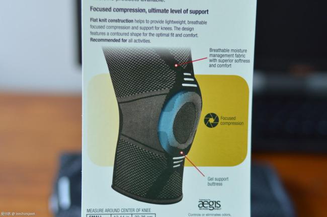 从外型看设计简洁,用手摸材质很厚,髌骨位置有特殊的环形凝胶垫付,可以减轻关节压力,给予髌骨更强的支撑,两侧有金属弹簧支撑条,很有弹性,可以很好的保护膝盖。