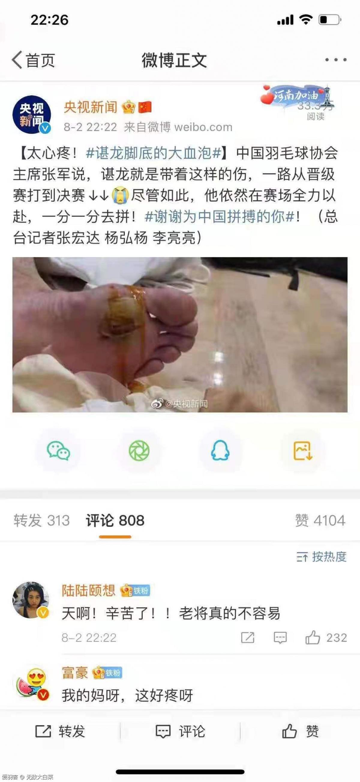 (张军在谌龙赛后发文介绍了谌龙比赛期间的血泡,从中我们能一窥老将进入决赛的艰难和决心)