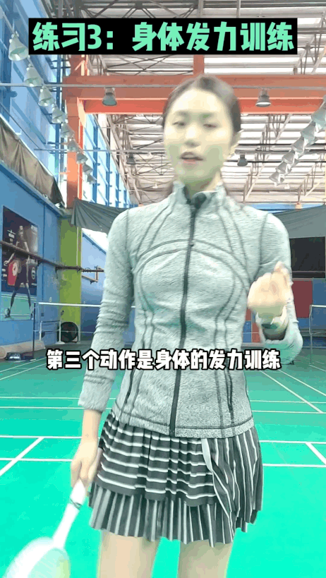 4、第三个动作是:身体发力训练。如果你想用反拍高远球打到后场只依靠手的力量是完全不够的。所以我们还要加上身体的发力,首先我们侧身完之后过来左脚一蹬地的时候,其实就处于一个收的状态,其实就是要准备下一个动作放。怎么放?靠我们的右脚一跨出去身体放,就把身体的力发出去了
