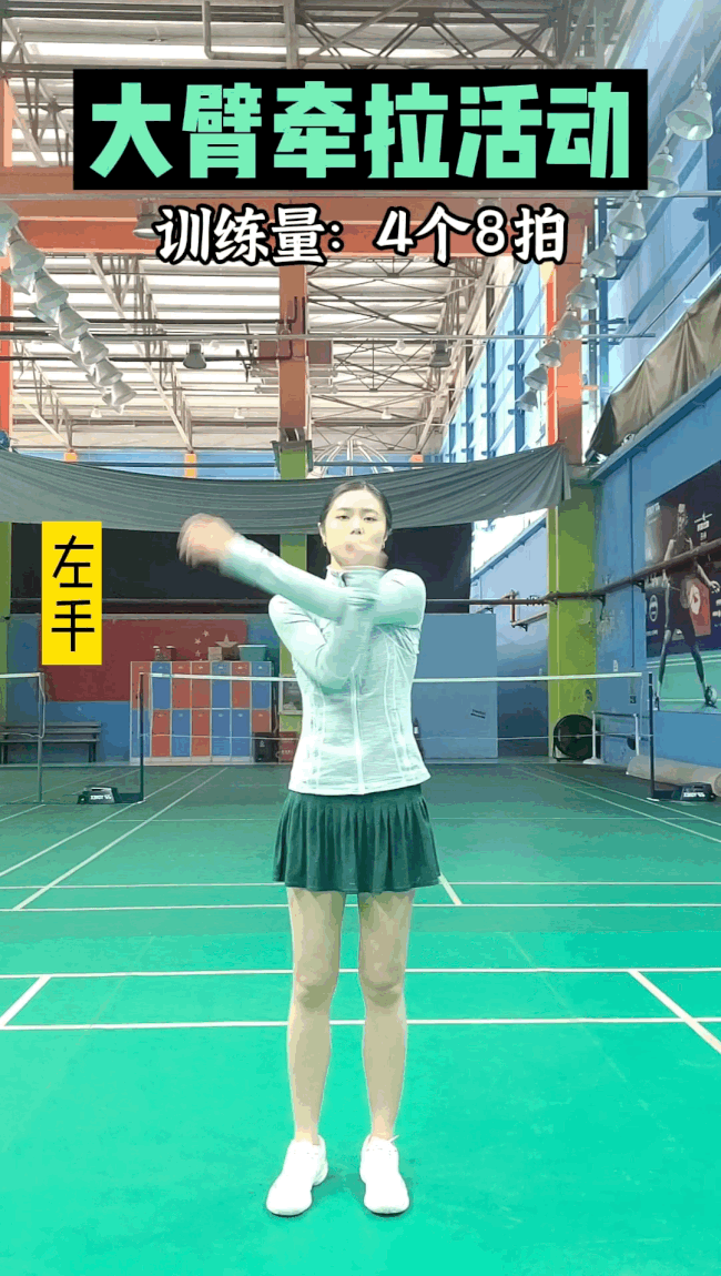 9、大臂牵拉活动。训练量:4个8拍