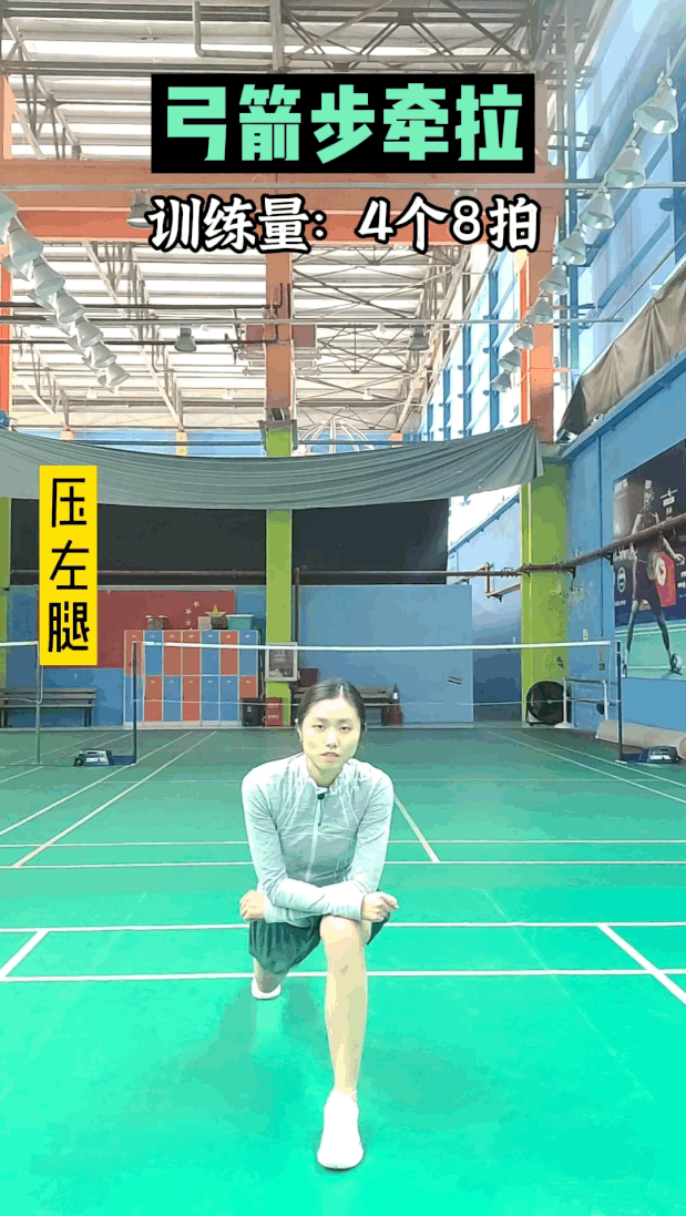 12、弓箭步牵拉。训练量:4个8拍