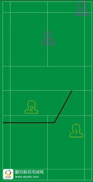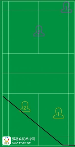 紫1选手在直线方向出球,通常吊直线多于拉直线后场,所以黄1选手的站位可以比平时偏前半步,对方吊直线网前时争取主动推对角,以造成对方的步法被动。