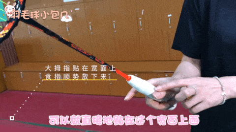 将持拍手虎口对着拍柄窄面的小棱边,大拇指和食指内侧紧贴球拍的宽面;中指、无名指、小拇指依次握住球拍;握好球拍后,看看虎口是否和球框在一条直线上;最重要的是握拍要放松。