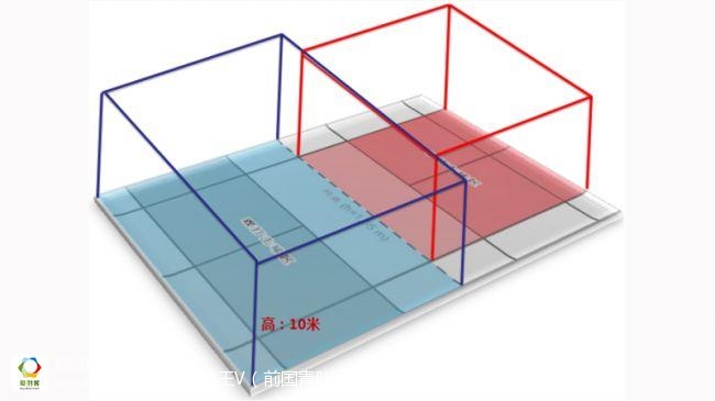 直到有一天,我忽然发现我一直忽略了一样东西,那就是高度!标准的比赛羽毛球场地,除了长和宽之外,还有球馆的高度(羽毛球馆的高度最低要求是9米),而我一直以来从未考虑过它。所以,说得再通俗易懂一点,就是对方的球场和我的球场都是一个长方体。见下图。