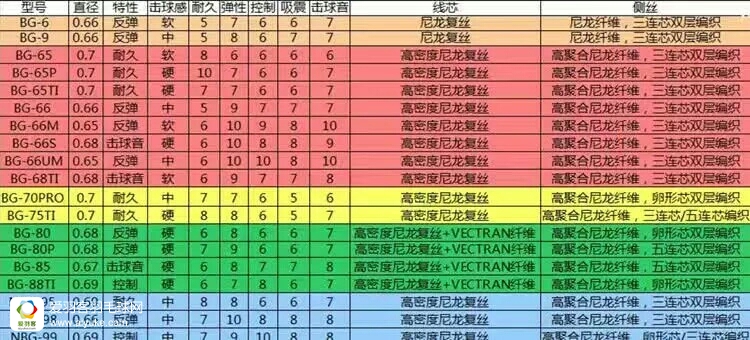BG65TI,在BG65的基础上加TI增加了弹性,牺牲了一部分的耐用性。击球音略好。提高了线的强度,更适合暴力攻击型选手。吸震能力与bg6565相同。0.70毫米的线径。