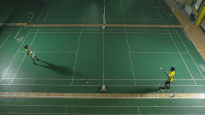 头顶吊直线球时,利用手指、手腕和前臂旋内的动作,由后向前下方挥拍轻击球托或羽毛的后部,吊球也可以用作防守过渡球。