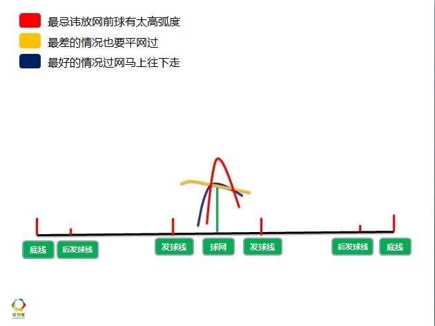 接发球放网,最好的情况是球过网马上往下走,最底线的条件你要平网过,最忌讳的情况就是球过网的弧度太高,因为容易成为一个菜球,即便不是菜球,也不能给对方造成威胁,反而会给自己造成威胁。