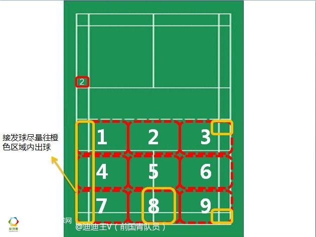 提示:但在比赛中,如果我一直接发球往边线走,对方势必会想办法提前预判来抓我的球路,这时候如果我适当变化,个别球选择走9号区域的边角,则会有比较好的效果,如果一上场就往9号位走,很容易被对方反抽,也不利于组织球路。再则,3号位和6号位不太建议打,3号区域是因为不太好打,对手法要求太高,容易失误,打过去了也不一定效果好,6号区域是因为球会从网前选手的正手侧击球区域经过,容易被反压回来,所以也不建议打。