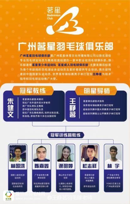 广州茗星俱乐部请来广州籍世界青年赛大满贯、前羽毛球国家队男单队员王睁茗挂帅,与前广东省队男子双打主教练朱建文带领一众有多年教学经验的青年教练。