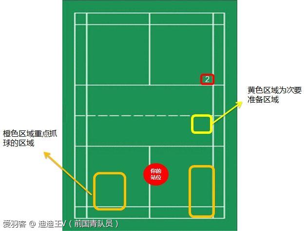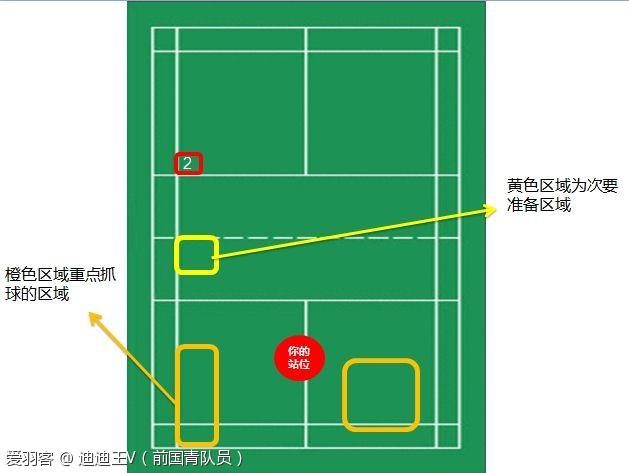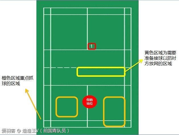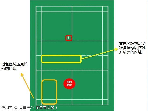 要注意的是上图的黄色部分,也就是网前区域,也要注意对方改放网。这里发球发长一点还有一个好处,就是当你的球较长时,对方放网的质量通常不会太高,因为不好控制。所以就算是你没有抓到后场球,但是接网前球应该也是游刃有余。