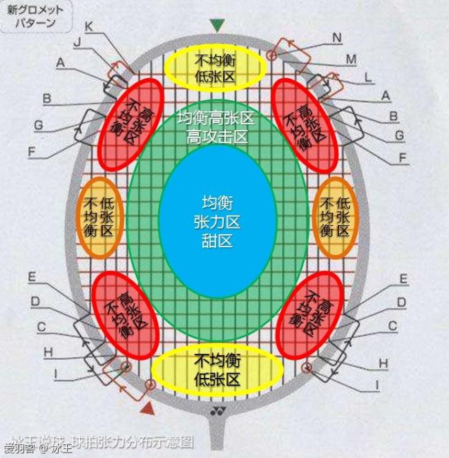 拍框内各线的张力值不同,在受到外力(球头撞击)作用的时候还会发生改变,总体上来说,拍框的中间部位(甜区)张力分布均匀、张力适中,周边张力分布不均、张力有大有小(多线区张力大、单线区张力小)