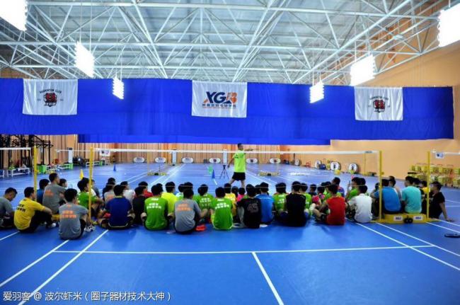通过自动开启的感应门进入一楼的训练场内,让刚从外面过来的我倍感温暖,很明显是开足了空调的结果,在工作人员的认真要求下,换了鞋进入场地,明亮宽敞的训练场 一边是九片标准的塑胶羽毛球场地,一些学员在练球,另一侧则是一排系列的体能训练设施,同样也有学员在进行训练,整个训练秩序严肃而紧凑,四周墙上喷涂的明亮的熊式黄让整个场馆显得非常的高大上,在墙壁的一侧,贴着熊导精心挑选的羽毛球世界冠军的击球动作照片并加以文字说明的羽毛球技术动作要领,每一个熊式羽毛球技术动作和这些世界冠军的动作都是高度相似的。