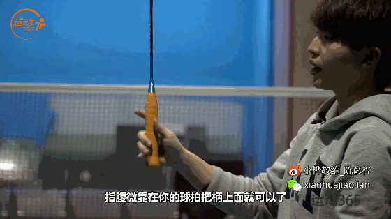 你在握拍的时候就轻松地让你的指腹,指腹微靠在你的球拍把柄上面就可以了
