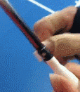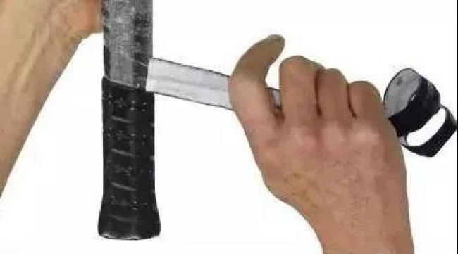 4、起始处与终止处的处理。缠至最后时,将背胶完全撕掉,掉转球拍,将手胶缠完用力攥紧。将底部凸起部分按下粘在拍盖上,包裹住底盖。