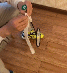 2、腿腿的缠法是将斜口放至底部中央位置(并非直接贴着底盖边缘),逐渐反向包裹底盖后再向下缠拍柄部分,这里有一点点的不一样。